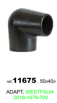 El producto CODO GOMA CORTO 50-40mm ADAPT. WESTFALIA se encuentra en el catálogo en la página 117 con el número 11675. Agromoise le agradece y le ofrece los productos de la más alta calidad.