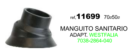 El producto MANGUITO SANITARIO 70-50mm ADAPT. WESTFALIA se encuentra en el catálogo en la página 117 con el número 11699. Agromoise le agradece y le ofrece los productos de la más alta calidad.