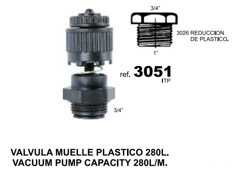 El producto VALVULA MUELLE PLASTICO 280L. se encuentra en el catálogo en la página 46 con el número 3051. Agromoise le agradece y le ofrece los productos de la más alta calidad.